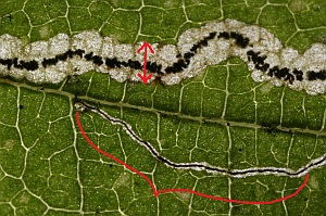 Bei Stigmella floslactella miniert die Raupe (nach Hering 1957) mit der Dorsalseite Richtung Blattoberseite. Das ist zwar direkt an der Raupe kaum feststellbar, wohl aber an der Lage des Schlitzes, durch den die Raupe die Mine verlassen hat: dieser liegt an der Dorsalseite, hier also an der Blattoberseite. Bei Stigmella microtheriella miniert die Raupe (nach Hering 1957) mit der Dorsalseite Richtung Blattunterseite. Der Schlitz, durch den die Raupe die Mine verlassen hat, liegt hier also an der Blattunterseite. (Wurde bisher an 3 Stigmella floslactella- und 10 Stigmella microtheriella-Minen überprüft und bis dahin als korrekt bestätigt. Weitere Untersuchungen zur Konstanz dieses Merkmals sind erwünscht)