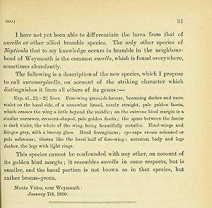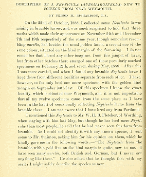 - Erstbeschreibung: Richardson, N. M. (1890): Description of a Nepticula (auromarginella) new to science from near Weymouth. — The Entomologist's Monthly Magazine 26: 30-31.