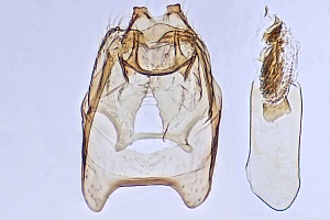 Nach einer Mail-Mitteilung von Erik van Nieukerken vom 16. Juni 2020 würden die beiden obigen Lebendfotos aus Niedersachsen, Sehnde, Bockmerholz, 24. April 2017 nicht Stigmella carpinella zeigen. Tatsächlich entspricht das Aussehen des Falters sehr genau jenem von S. tityrella aus der gleichen Aufsammlung, ebenfalls durch Barcoding bestimmt (siehe S. tityrella). Es lag somit der Verdacht nahe, dass diese Aufnahmen S. tityrella zeigten, die Barcode-Sequenz entspricht aber eindeutig jener von S. carpinella. --- Durch eine neue von Erik J. van Nieukerken durchgeführte Sequenzierung im März 2021 und eine Genitaluntersuchung (s. Fotos unten) wurde die Identität als Stigmella carpinella doch bestätigt und die Falterfotos am 1. April 2021 wieder sichtbar gemacht.