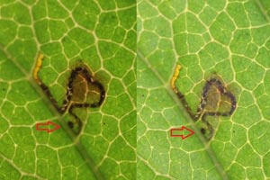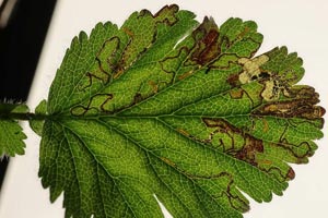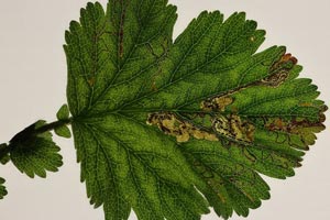 Die Art scheint auf Geum montanum (Berg-Nelkenwurz) als Raupennahrung begrenzt zu sein. "Die Eiablage erfolgt auf der Unterseite eines Grundblattes von Geum montanum" (Klimesch 1981). Schon in der Erstbeschreibung der Art (Klimesch 1940) wird die Mine sehr detailliert dargestellt: "Die Eiablage erfolgt auf der Unterseite bodennaher Blätter von Geum montanum, wo die dunkelgraue Eischale auch noch bei alten Minen schon mit geringer Vergrößerung wahrgenommen werden kann. Die oberseitige Mine entwickelt sich anfänglich als mehr oder minder stark gewundener Gang, um dann nicht selten dem Verlauf einer Blattrippe zu folgen ... Zuletzt - erweitert sich die Mine zu einem mehr oder minder ausgedehnten Platz, der in kleineren Blättern den Raum zwischen zwei Kippen ausfüllt, im allgemeinen aber von sehr unregelmäßigem Ausmaß ist. ..."