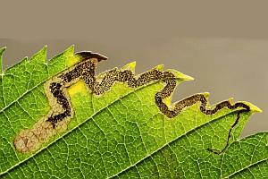 2: (Austrittsschlitz auf Blattoberseite, Kotlinie füllt anfangs gesamte Gangbreite, Eihüllle auf Blattoberseite): Deutschland, Niedersachsen, Region Hannover, Stadt Hannover, Misburg-Nord, 60 m, Rand des Misburger Waldes, an Ulme (Ulmus spec.), 25. Juni 2015 (det. & Freilandfoto: Tina Schulz)