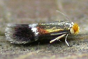 Bei Stigmella ulmivora sind die Fühlerspitzen deutlich weiß und der hellere, kupferbraune Bereich vom Flügel geht direkt bis zur weißen Binde.