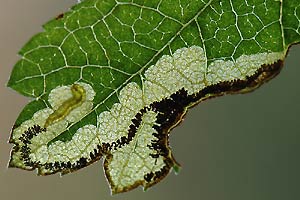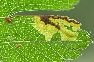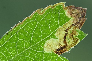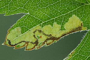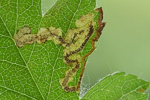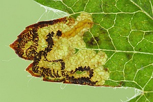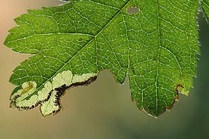 Auch nach Johansson et al. (1990) minieren die Raupen in Blättern von Weißdorn-Arten (Crataegus spp.) und gelegentlich Mispel (Mespilus germanica). Die Angaben von Schütze (1931) zu Sorbus und Apfel (Malus domestica) könnten sich auf andere Arten der Gattung beziehen. [Bladmineerders.nl] akzeptieren nur Crataegus monogyna, Crataegus laevigata und Mespilus germanica.