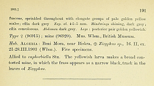 - Erstbeschreibung: Walsingham (1911): Algerian Microlepidoptera. — The Entomologist's Monthly Magazine 47: 12-15, 187-191. [Digitalisat auf biodiversitylibrary.org]