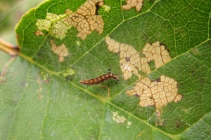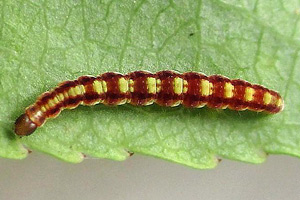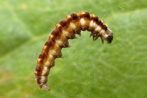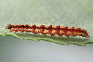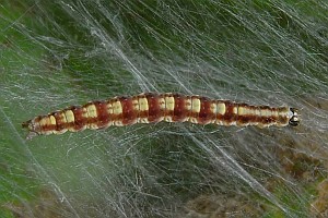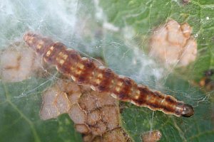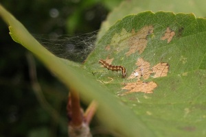 1-2: Österreich, Niederösterreich, Katzelsdorf an der Leitha, Park der Schule, Raupe (11 mm) in losem Gespinst auf der Oberseite eines Apfelbaum-Blattes (Malus domestica) gefunden und zum Fotografieren daraus vertrieben, 11. Oktober 2006 (Fotos: Peter Buchner), det. Mario Finkel & Rudolf Bryner