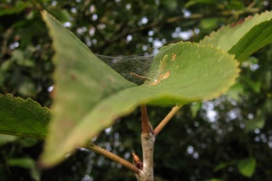 3: Deutschland, Schleswig-Holstein, Handewitt bei Flensburg, Garten, in Gespinst an der Blattoberseite von Apfelbaum (Malus domestica), 16. Oktober 2006 (manipulierte Freilandfotos: Mario Finkel), det. Mario Finkel, conf. Rudolf BrynerForum