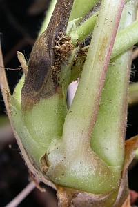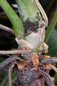 1-4: Befalls-Spuren (Kotauswurf) an Geranium macrorrhizum im Verlauf einer Eizucht: Griechenland, Provinz Ioannina, Vradeto (Beloi), 1400 m, vom 15. April 2006 bis Juni 2006, [1] Eintritts-Stelle der Raupe am Blattstiel, schon mit ein wenig Kotauswurf, [2] weiterer Kotauswurf der jungen Raupe, [3] Kotauswurf auch im Rhizom, ein Blatt geht am Raupenbefall zugrunde, [4] nach einiger Zeit sind weitere Blätter abgestorben, es kommen aber auch neue Triebe (det., Zuchtkommentar & Fotos Theo Garrevoet)