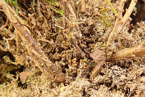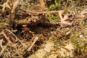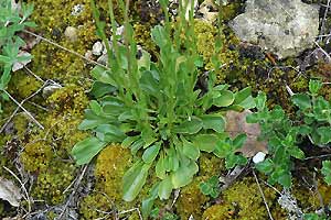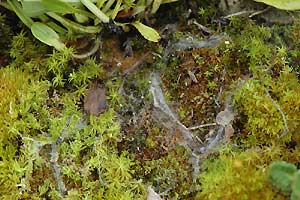 5: Gespinströhren im Moos unter den Blattrosetten: Schweiz, Neuchâtel, Cornaux, 490 m, flachgründige Kalkfelsplatte mit Moos und xerothermophilen Pflanzen bewachsen, 23. Mai 2008 (Freilandaufnahmen: Rudolf Bryner)Forum
