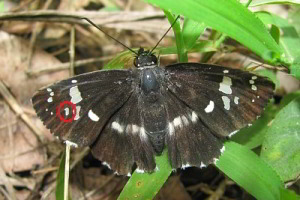 Zur Unterscheidung von Männchen und Weibchen: Der rot markierte Fleck auf dem Vorderflügel ist ein Unterscheidungsmerkmal der Geschlechter. Beim Männchen länglich oval und beim Weibchen runder oval mit der Spitze in Richtung der grossen Flecken.