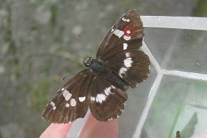Zur Unterscheidung von Männchen und Weibchen: Der rot markierte Fleck auf dem Vorderflügel ist ein Unterscheidungsmerkmal der Geschlechter. Beim Männchen länglich oval und beim Weibchen runder oval mit der Spitze in Richtung der grossen Flecken.