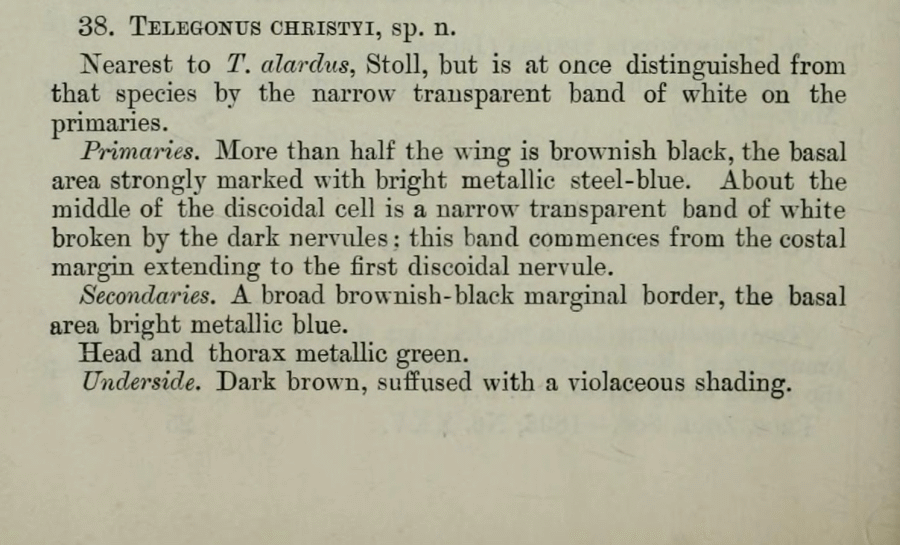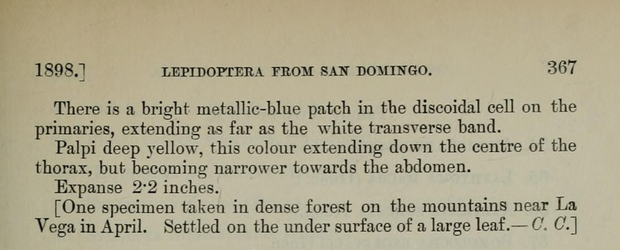 - Erstbeschreibung: Sharpe, E. M. (1898): On a Collection of Lepidopterous Insects from Domingo. — Proceedings of the General Meetings for Scientific Business of the Zoological Society of London for the Year 1898 (3): 362-369. — Digitalisat auf biodiversitylibrary.org: [366]
