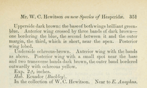 - Erstbeschreibung: Hewitson, W. C. (1876): Description of twenty new Species of Hesperidae. — The Annals and Magazine of Natural History, including Zoology, Botany, and Geology. Fourth Series 18: 347-355. — Digitalisat auf biodiversitylibrary.org: [350]