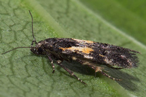 Die Ausdehnung des orangen Flecks ist bei T. luculella meist eher klein, aber das variiert. Die Form des Flecks ist entscheidender: Der ist bei T. luculella immer c-förmig und berührt den Vorderrand, während er bei T. flavimaculella wohl nie den Vorderrand berührt und in Richtung basalen Flügelteil sehr dünn wird (Maurizio König im [Forum], leicht abgewandelt).
