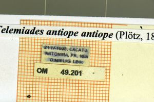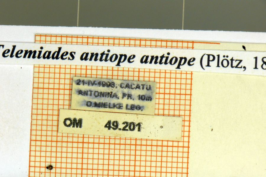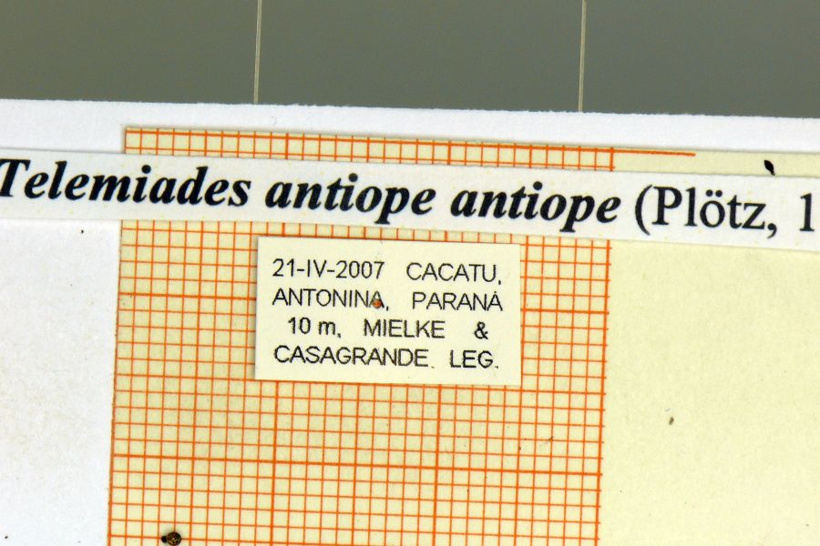 Siewert, Mielke & Casagrande (2020: 39): “Holotype male deposited at DZUP with the following labels: / Holotypus/ 21–IV–2007 Cacatu, Antonina, Paraná [Brazil], 10m, Mielke & Casagrande leg./ DZ 26.138/ Holotypus Telemiades atlantiope Siewert, Mielke & Casagrande det. 2019/. Allotype female deposited at DZUP with the following labels: / Allotypus/ 21–IV–1998, Cacatu, Antonina, P[a]R[aná] [Brazil], 10m O. Mielke leg./ OM 49.201/ Allotypus Telemiades atlantiope Siewert, Mielke & Casagrande det. 2019/.” — Eine lange Reihe von Paratypen aus Brasilien, ♂♂ und ♀♀; 17 ♂♂ aus Argentinien.