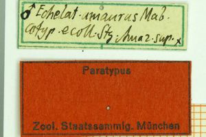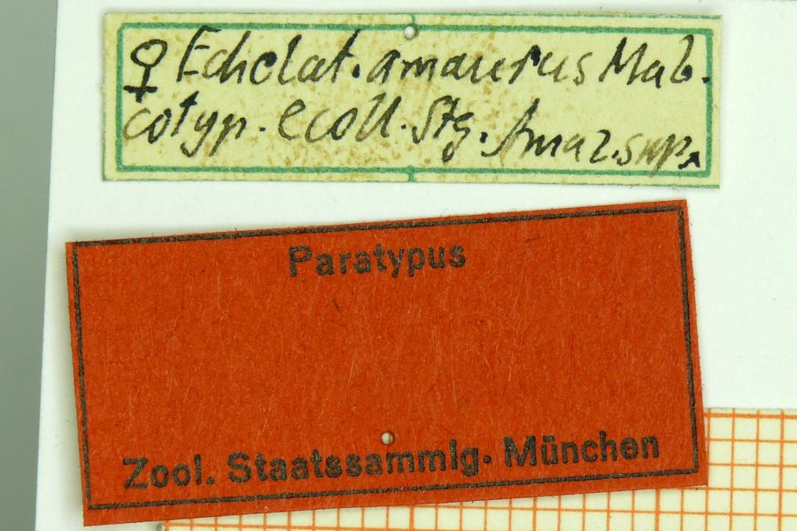 13-15: Syntypus ♂ von Echelatus lucina Schaus, 1913, Daten siehe Etiketten (fot.: Bernard Hermier, Fotos bearbeitet: Michel Kettner), coll. National Museum of Natural History, Washington, D.C., USA.