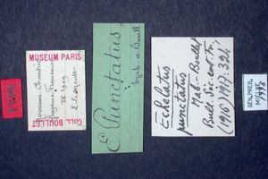 13-15: Paralectotypus ♀ von Echelatus punctatus Mabille & Boullet, [1917], Daten siehe Etiketten (fot.: Bernard Hermier, Fotos bearbeitet: Michel Kettner), coll. Muséum national d'histoire naturelle. Paris.