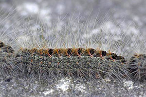 Falterstirn mit gezacktem Vorsprung. Falter durchschnittlich kleiner, aber sehr ähnlich dem von Thaumetopoea pityocampa, Hinterflügelfransen deutlich gescheckt.