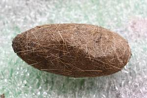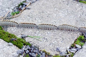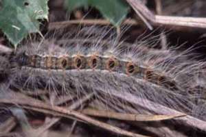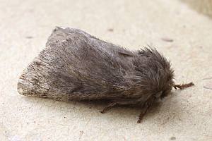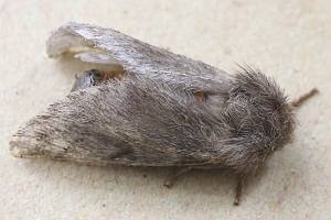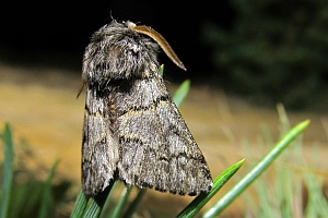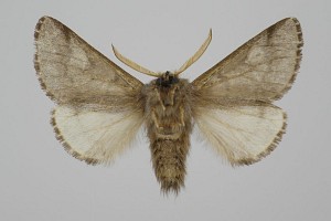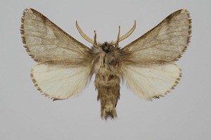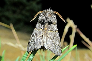 Falterstirn mit gezacktem Vorsprung. Falter durchschnittlich kleiner, aber sehr ähnlich dem von Thaumetopoea pityocampa, Hinterflügelfransen deutlich gescheckt.