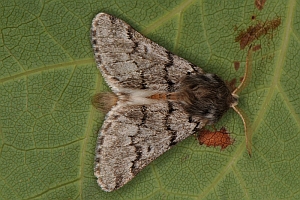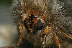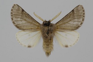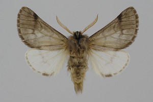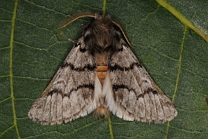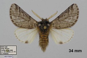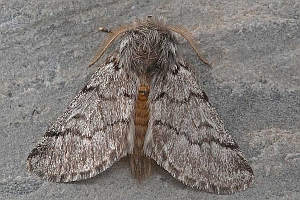 Falterstirn mit deutlich gezacktem Vorsprung. Falter durchschnittlich größer, aber sehr ähnlich dem von Thaumetopoea pinivora, Hinterflügelfransen nicht gescheckt.