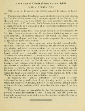 - Erstbeschreibung: Turner, H. J. (1925): A new race of Cidaria (Thera) variata, Schiff. — The Entomologist's Record and Journal of Variation 37 (2): 25.