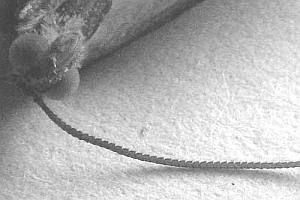 Fühler der Thera britannica Männchen: Mittler Fühlerglieder kurz-rechteckig bis nahezu quadratisch, jedoch proximal verengt und distal erweitert, daher bei schwächerer Vergrößerung Fühler im Profil deutlich sägezähnig.