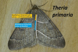 Theria primaria HAWORTH, 1809 ist immer dunkler als rupicapraria und macht einen deutlich düsteren Eindruck. Von den Begrenzungslinien des Mittelfeldes ist nur die äussere deutlich. Der Mittelpunkt ist nahezu dreieckig. Das Mittelband auf den Stummelflügeln der weiblichen Tiere verjüngt sich nicht.