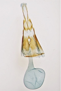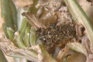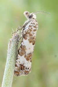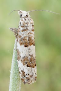 Budashkin (1993: 52) ergänzte dann für die Krim den Polei-Gamander (Teucrium polium). Woher schon Kennel (1921: 599) diese Nahrungspflanze kannte, ist mir nicht klar - jedenfalls schrieb er unter dem doppelt missgestalteten Namen (zweimal "n" statt "u") "Epiblema conlernana Dup.": "De Raupe ist schmutzig weißlich mit bräunlichen Wärzchen Kopf und Nackenschild sind schwarz, die Analklappe ist schwarzbraun. Sie lebt im April (wohl überwintert) in Teucrium polium".