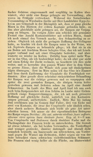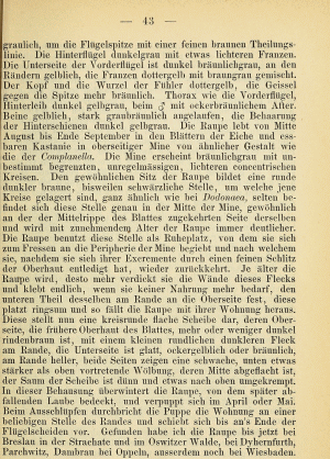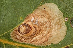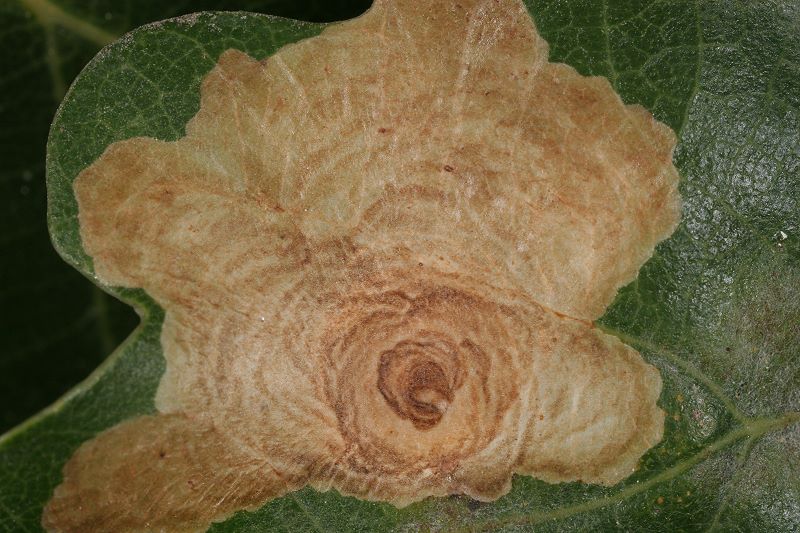 Ich finde die Minen im Oktober, November an Eichenbüschen oder tief hängenden Eichenästen. Günstig ist natürlich, wenn die Minen noch intakt sind. Dann schneide ich besetzte Blätter mit etwa 20-30 cm langen Zweigstücken und stelle diese ins Wasser. Nach einigen Tagen liegen dann darunter die kreisförmig ausgeschnittenen, flachen Überwinterungsminen (oder wie man die Gebilde dann nennen mag, Kokons oder Gespinste sind es ja eigentlich auch nicht). Man braucht unter den Zweigen kein spezielles Substrat und die Zweige im Wasserglas müssen in keinem weiteren Gefäß stehen, da die Gebilde nur herunter fallen und nicht seitwärts bewegt werden. Sie bestehen aus der oberen Epidermis des Eichenblattes und unten aus einem sehr feinen, fast pergamentartig wirkenden Gespinst. Dieses ist in der Mitte gewölbt und deutlich dunkler als der Rand. Ist man im Jahr zu spät unterwegs, so sind die fehlenden Teile in den Minen der Blätter mit einiger Übung leicht sichtbar. Dann suche ich unter den Büschen im Laub direkt am Boden. Auch da kann man die Gebilde relativ gut sehen, vor allem, wenn die ursprüngliche Unterseite nach oben liegt. Die Überwinterung erfolgt in Plasteschachteln mit Gazedeckel. Unten befindet eine etwa 5 cm dicke Schicht aus Torf und Torfmoos, darüber die Gebilde und darauf ein paar trockene Eichenblätter. Meist zerschneide ich die Blätter mehrfach, da sie sich dann besser schichten lassen. Das Ganze kommt unter die im Herbst im Garten umgestülpten Regentonnen und wird erst im Frühjahr (in diesem Jahr am 02. April) direkt ins Zimmer geholt und dann regelmäßig besprüht. Nach etwa 3 Wochen sitzen dann die Falter im Gefäß.