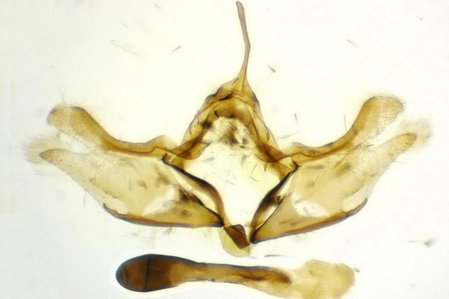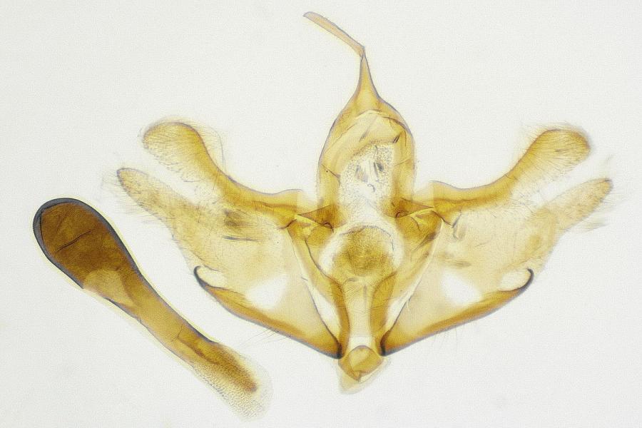 1: ♂, Genitalpräparat des [hier] abgebildeten Falters: Österreich, Steiermark, Graz, St. Peter, ca. 380 m, Garten, Mischwaldrand, am Licht, 20. März 2017 (det., präp. & Foto: Horst Pichler), conf. Axel SteinerForum