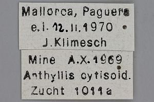 Klimesch (1975) informiert: „Zur vorliegenden Beschreibung wurden die Ergebnisse der durchgeführten Zuchten (17 ♂♂ und 9 ♀♀) sowie 5 an der Futterpflanze gefangene Imagines (Paguera, Mallorca, 16.V.1969) verwendet. Der Holotypus und die Paratypen befinden sich in meiner Sammlung, einige Paratypen wurden auch in den Sammlungen des Naturhist. Museums, Wien, und des British Museum (N.H.), London, deponiert.“ Die Klimesch-Sammlung befindet sich heute in den Zoologischen Staatssammlungen München (ZSM).