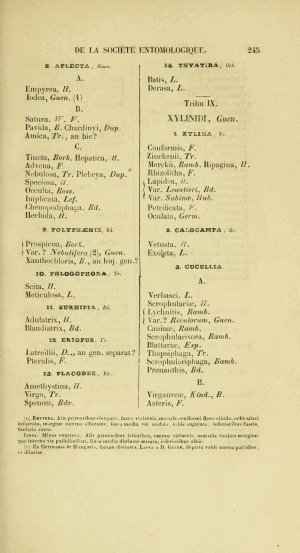 - Guenée, A. (1841): Noctuarum europaearum index methodicus, classificationis in Ann. soc. entom. Gallic. editae tabulam fingens. — Annales de la Société entomologique de France 10: 235-250.