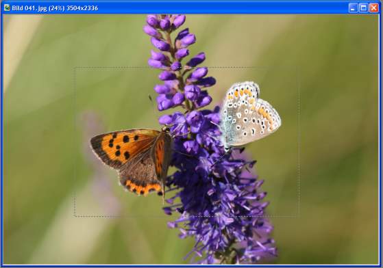 - Klicken Sie mit dem linken Mauszeiger ins Foto und verschieben Sie die Maus mit gedrückt gehaltener Taste so lange, bis der durch eine gestrichelte Linie angedeutete Motivausschnitt optimal ist. Im abgebildeten Beispiel ist das Originalbild 3504 x 2336 Pixel groß, und es wurde ein Ausschnitt von 2100 x 1400 Pixel gewählt: