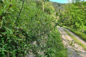 5: Larvalhabitat mit Schlehe (Prunus spinosa), Deutschland, Hessen, Rheingau-Taunus-Kreis, Mittelrhein, Lorchhausen, extensiv pflegebeweidete Weinbergsbrachen (NSG), 165 m, 9. Mai 2024 (Foto: Hermann Falkenhahn)Forum