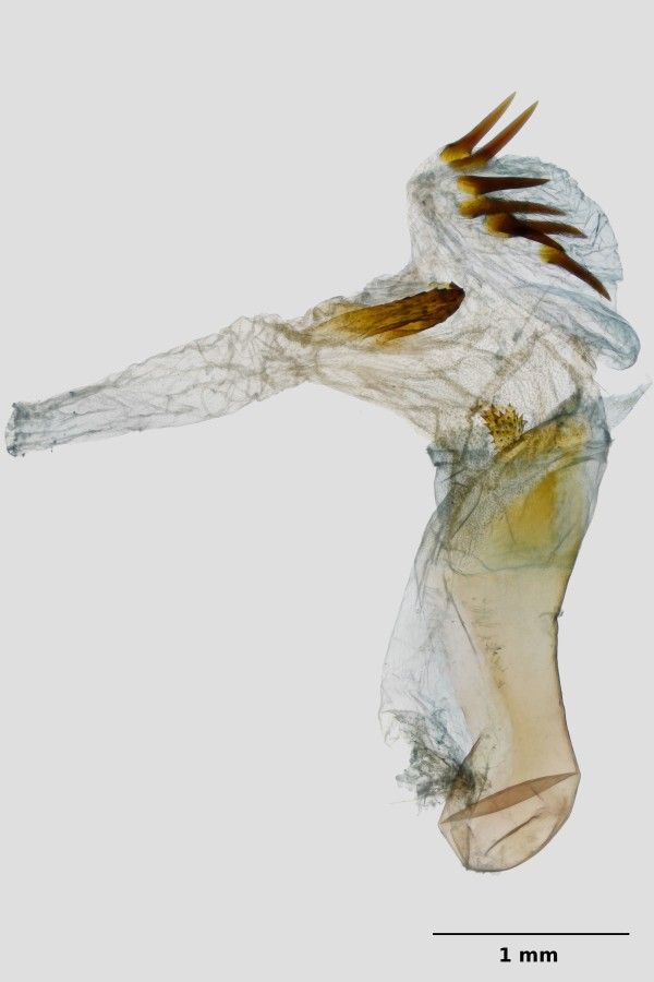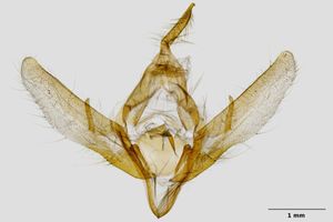 1-3: ♂, Ungarn, Komitat Veszprém, Tótvázsony, Halb-, Trockenrasen, 330 m, 47.02°N, 17.72°E, 1. April 2011, am Licht (prep., gen.det. & Foto: Hartmuth Strutzberg), 1: Valvenkomplex gepresst, 2: Phallus gepresst, 3: siebtes und achtes Sklerit, dorsal aufgeschnitten, proximale Seite oben, Referenz: Ronkay et al. (2001), Seite 401, Fig. 184Forum