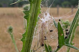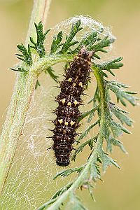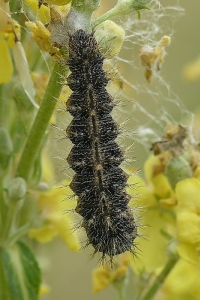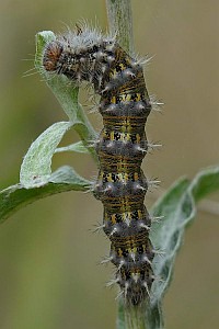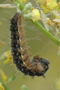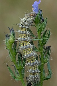 Die Raupen finden sich in Mitteleuropa fast ausschließlich von Mai bis August, selten bis Oktober. Die Raupe ist nicht wählerisch. Neben Disteln (hauptsächlich Carduus- und Cirsium-spp.) frisst sie auch an Brennnesseln (Urtica-spp.), Flockenblume (Centaurea-spp.), Malven (Malva-spp.), Beifuß (Artemisia-spp.) und einer Fülle anderer Pflanzen. Wenn sich die Raupen bei Massenvermehrungen gegenseitig die Nahrungspflanzen wegfressen, können sie zuweilen in Gärten und auf Feldern schädlich werden. Sie fressen dann notfalls auch an völlig untypischen Nahrungspflanzen, wie z. B. Möhren (Daucus carota), Klee (Trifolium-spp.) oder gar Bohnen (Phaseolus vulgaris) und Berardia subacaulis [Forum].