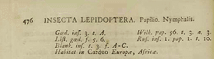 - Lectotypus-Festlegung: Honey, M. R. & M. J. Scoble (2001): Linnaeus's butterflies (Lepidoptera: Papilionoidea and Hesperioidea). — Zoological Journal of the Linnean Society 132: 277-399.