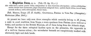- Erstbeschreibung: Godman, F. D. & O. Salvin (1879-1901): Biologia Centrali-Americana. Insecta. Lepidoptera-Rhopalocera. Vol. III. (Plates.): pl. 1-24, 24a, 25-112. — Digitalisat auf biodiversitylibrary.org: [pl. 101 fig. 12]