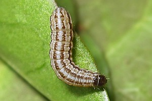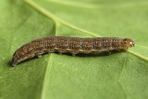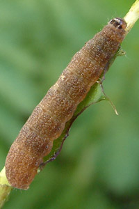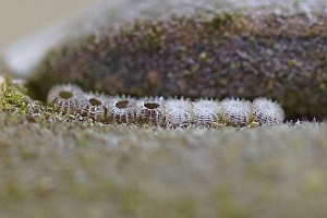 14: Deutschland, Niedersachsen, Umgebung Rodenberg, brachliegendes Grundstück mit fortgeschrittener Verbuschung, ca. 70 m, Jungraupe an Kätzchen von Salweide (Salix caprea) 7. April 2013, e.l. 21. Juli 2013 (leg., cult., det. & Foto: Tina Schulz) [Forum und weitere Falterbilder]