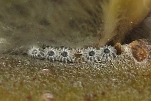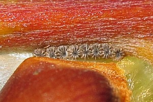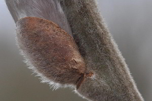 4: bereits leeres Eigelege, Deutschland, Niedersachsen, Umgebung Rodenberg, brachliegendes Grundstück mit fortgeschrittener Verbuschung, ca. 70 m, an Kätzchen von Salweide (Salix caprea) 7. April 2013 (leg., cult., det. & Studiofotos: Tina Schulz)Forum