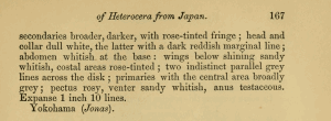 - Erstbeschreibung: Butler, A. G. (1878): Descriptions of new Species of Heterocera from Japan. Part II. Noctuites. — The Annals and Magazine of Natural History, Including Zoology, Botany, and Geology. Fifth Series 1: (1) 77-85, (2) 161-169, (3) 192-204, (4) 287-295. London (Taylor and Francis).