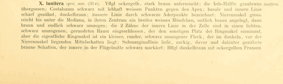 - Xylina lunifera Warren, 1910 [Originalkombination] [nicht Xylena, wie in der Fauna Europaea [last update 29 August 2013, version 2.6.2] angegeben]