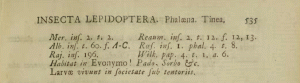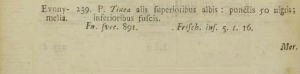 - Lectotypus-Festlegung: Robinson, G. S. & E. Schmidt Nielsen (1983): The Microlepidoptera described by Linnaeus and Clerck. — Systematic Entomology 8: 191-242.