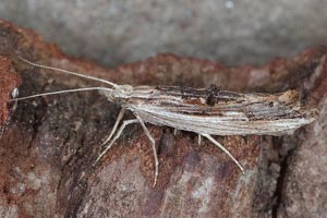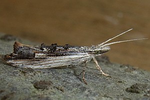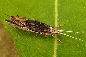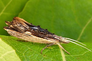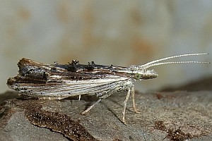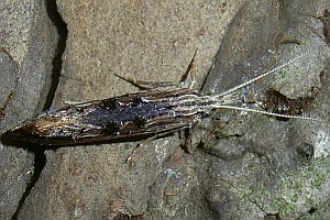 Färbung nach dem Typ "Totholz". Charakteristisch ist die Längsteilung der Vorderflügel in eine helle Vorder- und eine dunkle Hinterhälfte. (Text: Rudolf Bryner)