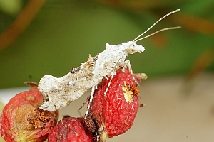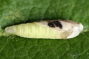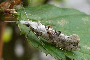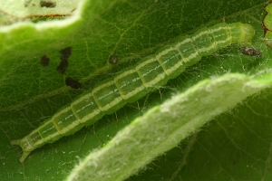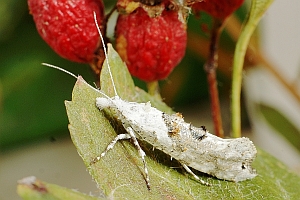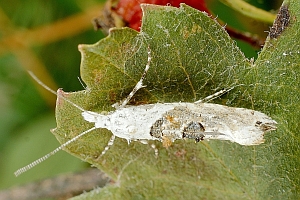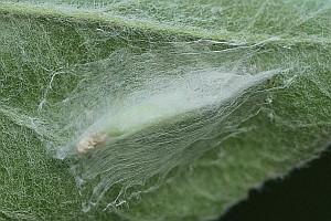 Schütze (1931) schreibt: "Nach Wocke polyphag an Laubholz auf der Blattoberseite unter leichtem Gespinst (Sorhagen), am häufigsten an Apfelblättern [Malus domestica] (Wocke). Pirus communis [Pyrus communis agg.], Crataegus, Prunus domestica." "Polyphag" dürfte falsch sein, denn die Liste besteht ausschließlich aus Rosaceae. Von diesen geistern noch einige weitere durch die Literatur - sie könnten durchaus stimmen. Wirklich gut abgesichert ist von diesen Pflanzen nur der Apfelbaum - für alle anderen verwende ich hier bis zur endgültigen Bestätigung ein Fragezeichen - vermutlich stimmen sie aber alle, und insbesondere Weißdorn-Arten könnten nach den Fundstellen der Falter auch eine größere Rolle spielen. Aus Korea liegt die Meldung eines Raupenfunds an Prunus sargentii vor ([gbif.org]). Helmut Deutsch züchtete einen Falter, den er in Österreich als Raupe an Schlehe fand.