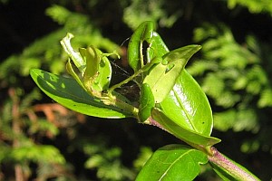 1: Fraßbild der Jungraupen an Lonicera pileata: Deutschland, Niedersachsen, Landkreis Schaumburg, Rodenberg, Garten, 70 m, 28. Mai 2013 (Foto: Tina Schulz)Forum