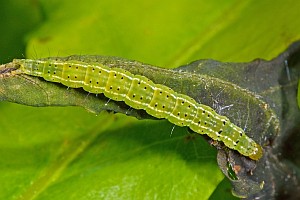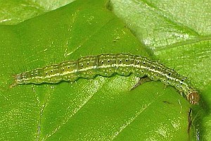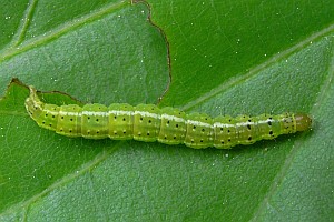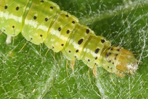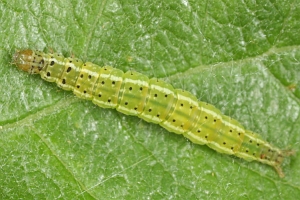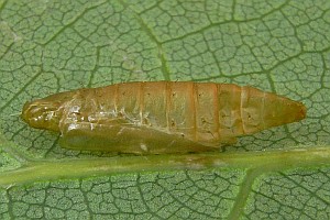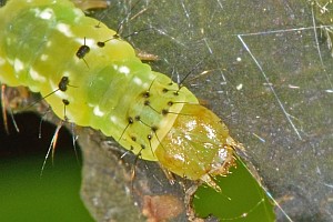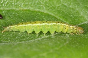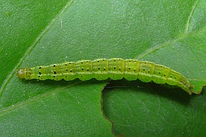 Die Raupe von Ypsolopha parenthesella unterscheidet sich insbesondere durch den mehr einfarbigen hellbraunen Kopf sowie die dicken schwarzbraunen Punkte auf den ersten Segmenten und die kontrastreicher gezeichnete Nackenplatte von den ansonsten sehr ähnlichen Ypsolopha sylvella und Ypsolopha alpella. (Heidrun Melzer)
