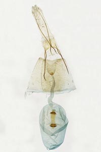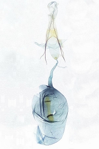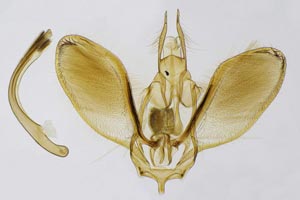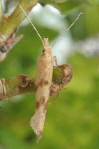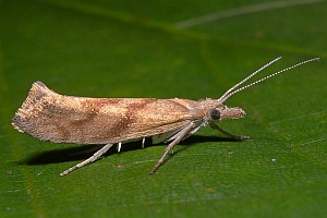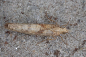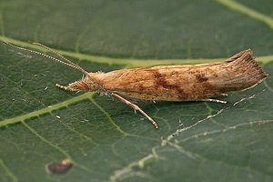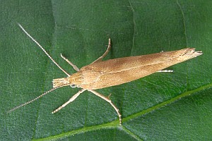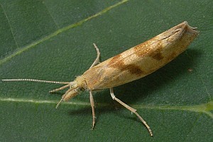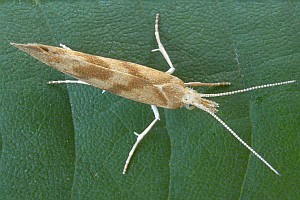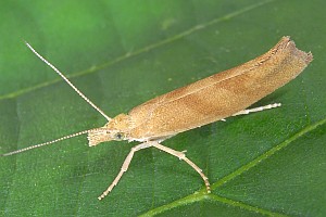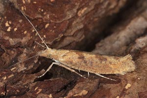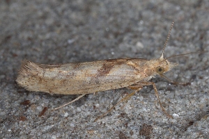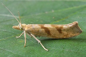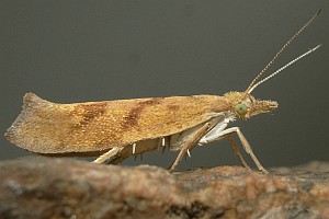 Bräunliche Art, ohne Gitterzeichnung und mit zwei meist deutlichen, dunkelbraunen Schrägbändern auf den Vorderflügeln. Kopf und Thorax braun.