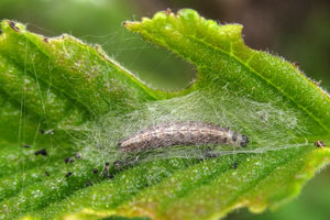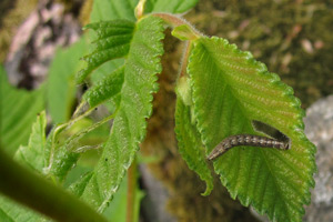 Gemäß Literatur leben die Raupen an verschiedenen Laubbäumen, genannt werden beispielsweise Ulme, Buche, Apfelbaum, Eiche und Lonicera-Arten. Die Liste ist dabei sehr zu hinterfragen, denn Ulmen spielen sicher die zentrale Rolle und es ist durchaus möglich (oder wahrscheinlich), dass die anderen Arten der Liste auf Fehlbestimmungen der Raupen beruhen. Interessant ist der oben gezeigte Raupenfund an Traubenkirsche in der Nähe von Ulmen - leider erfahren wir da zu wenig, ob die Raupe hier selbst gefressen hat oder nicht. Burmann (1985) meldet aus Tirol mehrere Raupenfunde an Berg-Ulmen, einen an "Ulmus sp.".