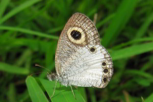 Ypthima ceylonica ist mit dem seltenen Ypthima singala zu verwechseln. Die Oberseite macht die Identifikation eindeutig, denn Ypthima singala ist oberseitig ohne Weiß. Text: Peter Ginzinger.