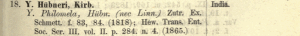 - Bezug der Indikation in der Erstbeschreibung: Hübner, J. (1818): Zuträge zur Sammlung exotischer Schmettlinge [sic], bestehend in Bekundigung einzelner Fliegmuster neuer oder rarer nichteuropäischer Gattungen. Erstes Hundert: 1-40, pl. [1]-[35]. Augsburg.